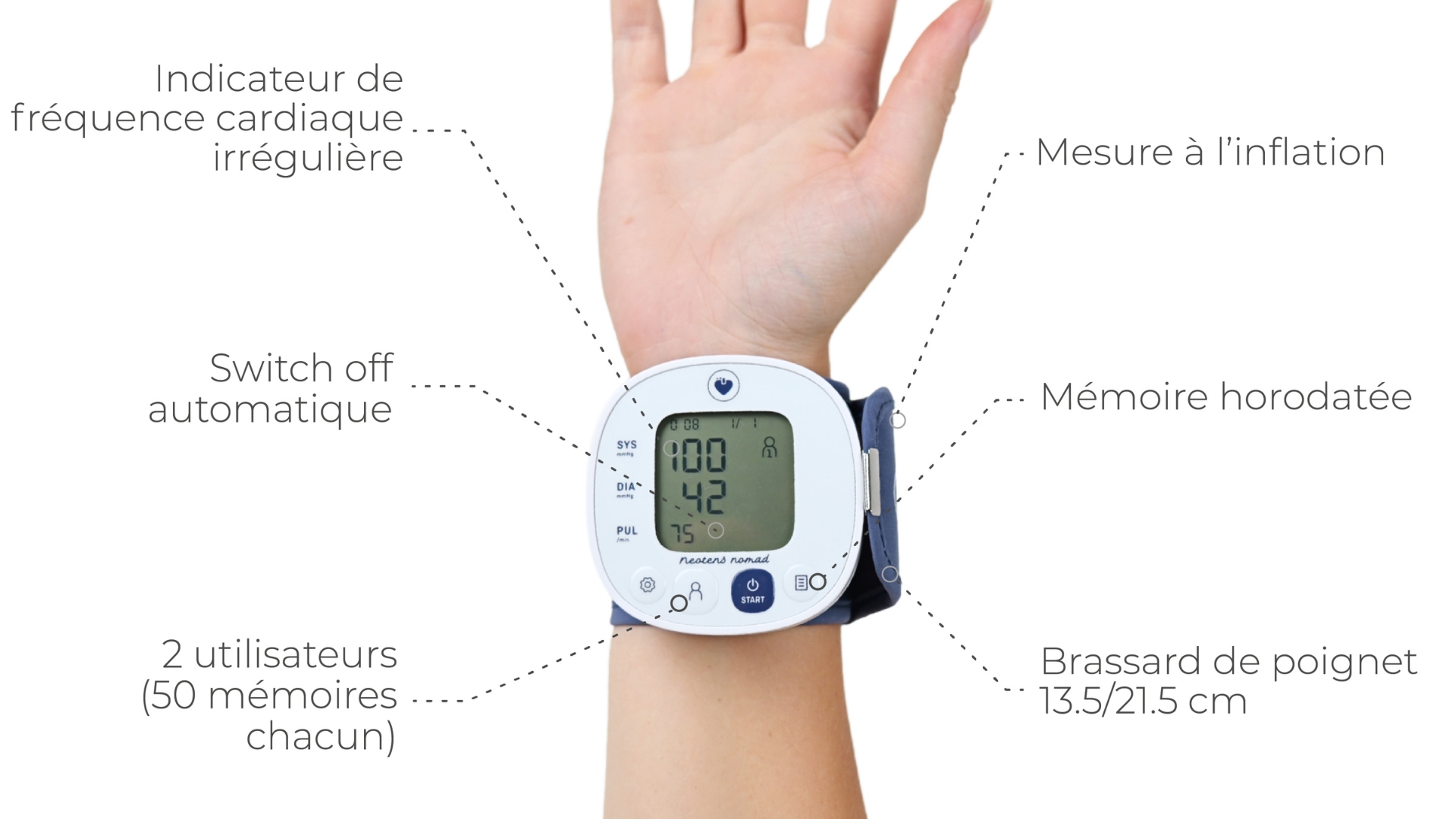 Adapté à tous, Neotens® Nomad offre une utilisation intuitive avec seulement deux boutons. Il peut enregistrer les mesures de deux utilisateurs distincts, avec 50 mémoires horodatées par profil, permettant un suivi personnel et structuré de la tension artérielle.